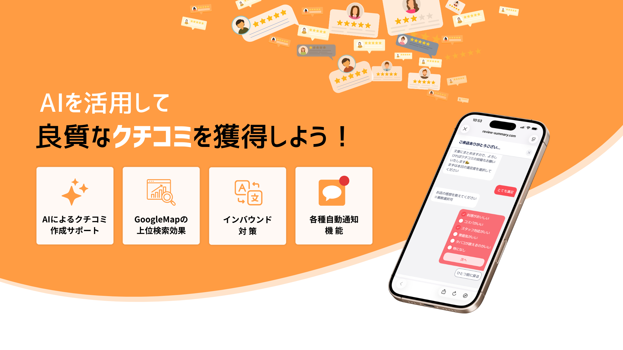 お客様のクチコミを読み取ってAIが最適な返信文を作成し送信。ポジティブなクチコミにもネガティブなクチコミにも最適なタイミングで最適な返信をすることで顧客満足度とGoogleの評価を高める効果が見込まれます。